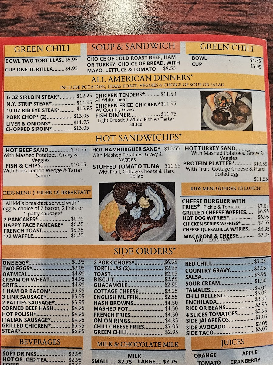 Mexican-Inspired Dishes such as chili rellenos, tamales, huevos rancheros, and green chili and cheese omelets are available, often served with potatoes or eggs. These items reflect a blend of traditional diner and regional flavors.
